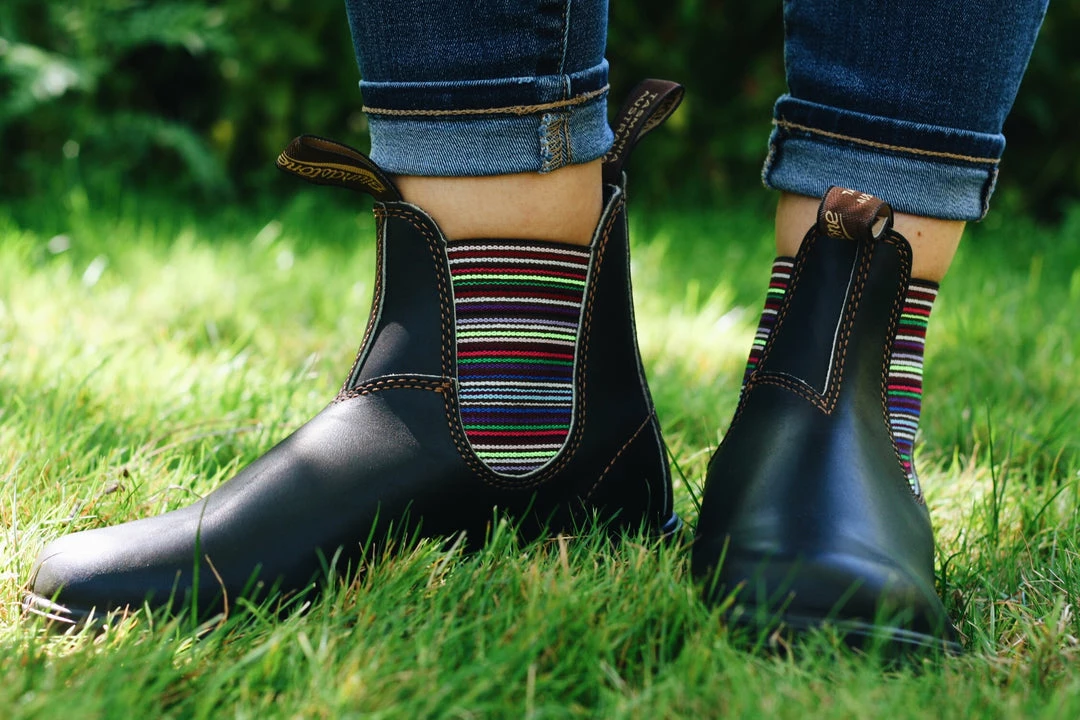 Built on the classic Blundstone 500 series construction, the 1409 adds a fun update with multicolor stripes on the elastic gore. Rain or shine, these boots will brighten your day and support your feet.Β