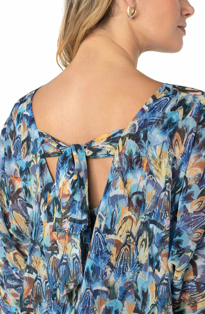 Make a statement in this gathered hem dolman tie back top in a beautiful painted feather print. Perfect for brunch or special occasions.