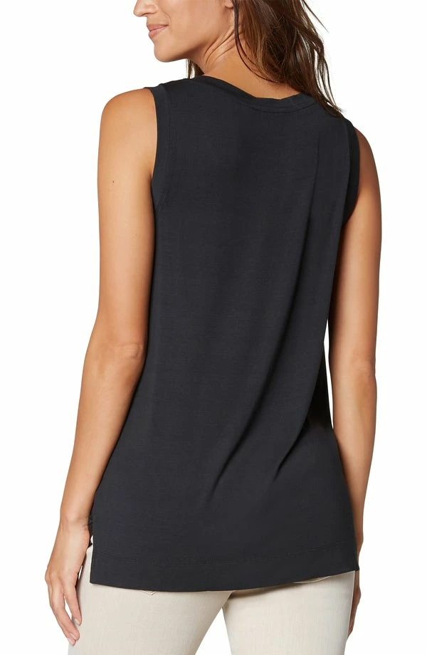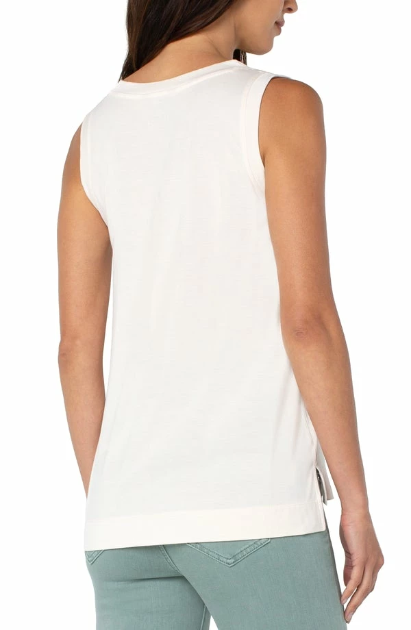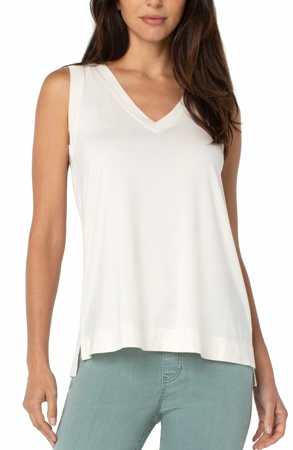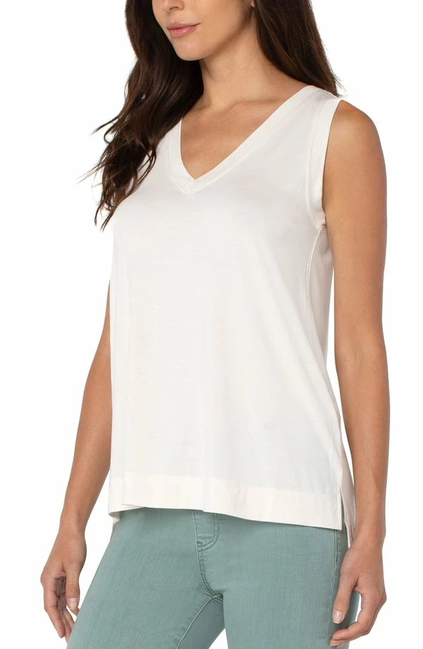 Our sleeveless v-neck knit tee is the fabulous choice when building up you wardrobe. This easy addition works well with anything! Super soft, comfortable and effortless!