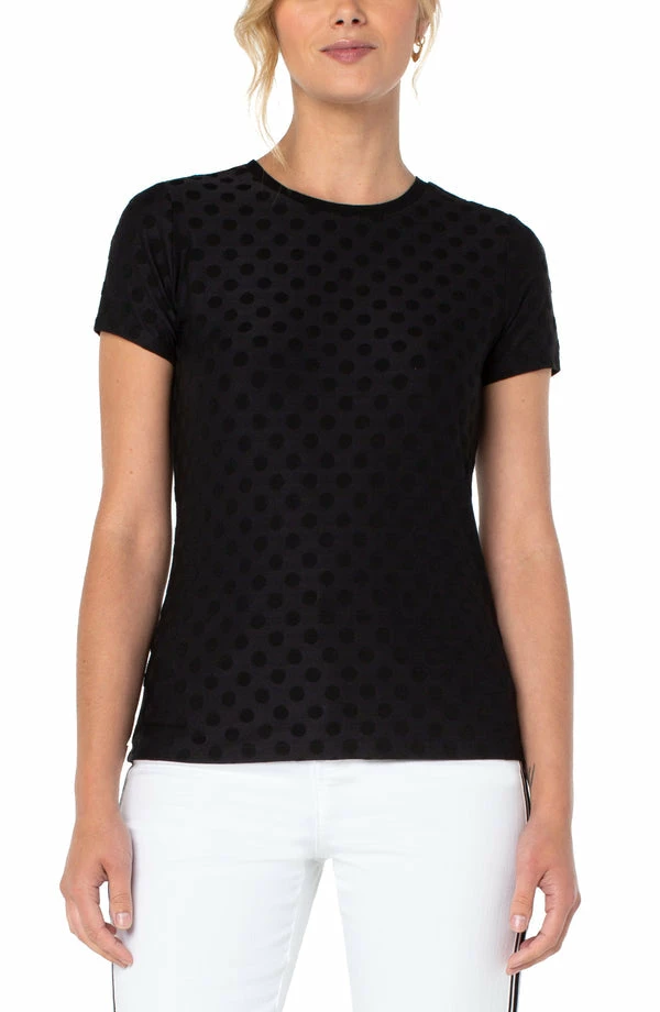 There’s nothing better than a classic tee! Our crew neck tee features a slim fit and a tone-on-tone polkadot print making this the perfect layering piece.