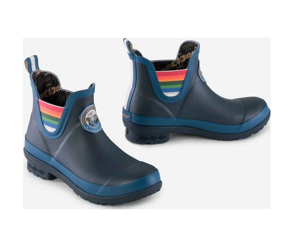 Puddle-proof rain boots showcase our beloved National Park stripes and vintage logo. Constructed of premium rubber with no-slip soles and exclusive Mountain Majesty tread. Cushioned insoles and internal shank system provide all-day comfort and support; pull-tab allows for easy on-and-off. Moisture-wicking linings feature our iconic Harding pattern.